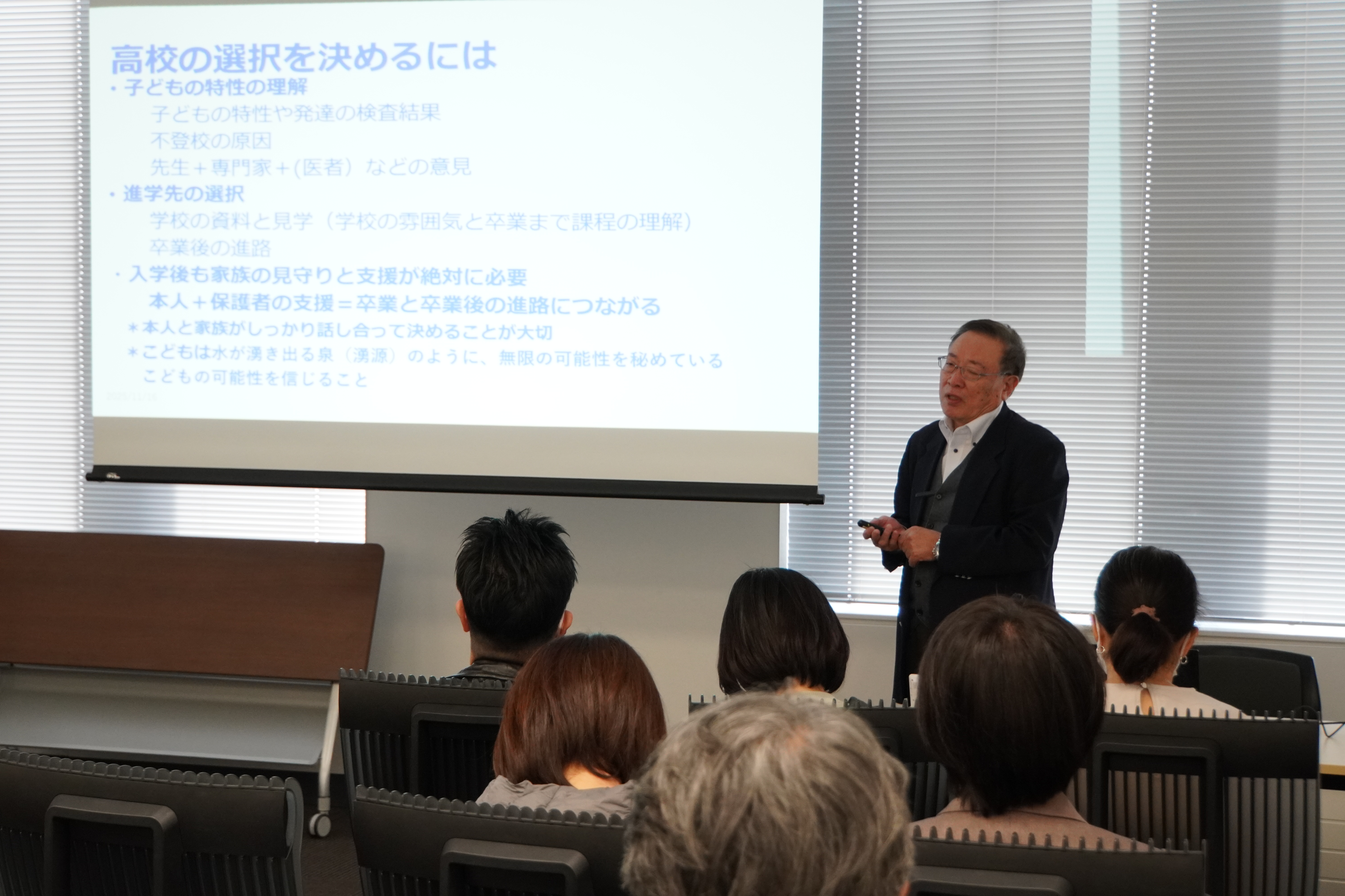 土佐先生は、「不登校生・発達障がい児の進路選択」と題した講演も実施。不登校経験者や発達障がいのある子どもたちが自分に合った進路選択をするにはどうしたらいいのか。長年、不登校経験者の高校進学、高校中退者・中卒者の高卒認定試験合格、合格後の大学・専門学校進学・就職などを支援してきた土佐先生だからこそ話せる内容が詰まった講演でした。